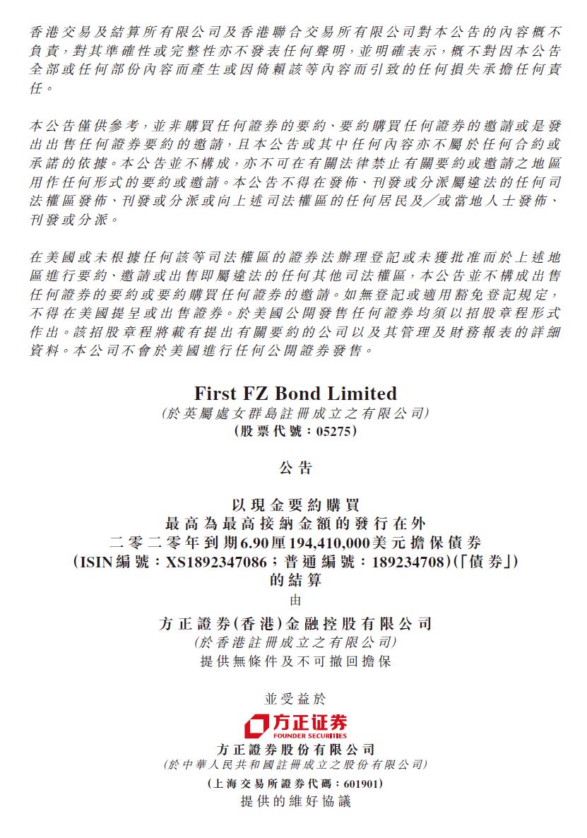 方正證券境外債回購結(jié)算公告